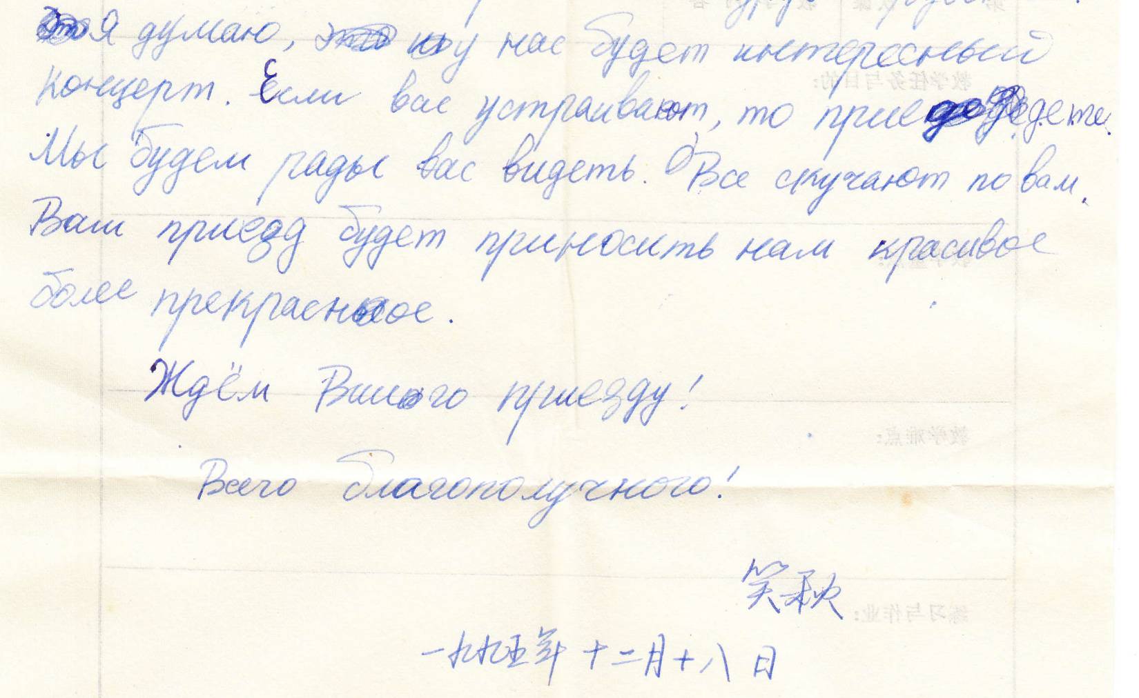 Ваша китайская ученица Цзи Чуньхуэй. 1995.01.06.»