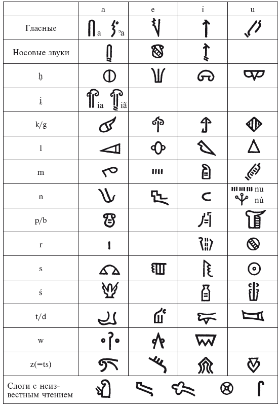 *Консонантное письмо. Так называемые консонантные знаки, то есть знаки согласных, египетской и западносемитской письменностей рассматриваются в данной книге как слоговые знаки с неопределенными гласными.