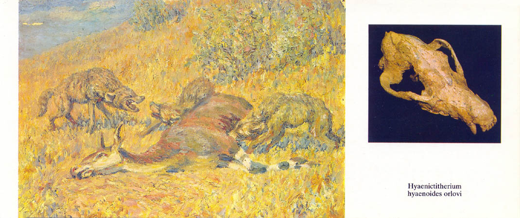Из хищников чаще всего встречались остатки странных животных иктитериев, которых называют шакалами гиппарионовой фауны. На самом деле они не имеют никакого отношения ни к шакалам, ни к собакам, ни к волкам. Ученые поняли это давно, еще в прошлом веке. Но от кого произошли эти животные, от гиен или виверр, было неизвестно. В 1986 году киевский ученый Ю. А. Семенов выяснил, что среди хищников, называемых иктитериями, были очень похожие друг на друга потомки гиен и потомки виверр. Найденный в Карабулаке череп (см. фото) принадлежал гиениктитерию.