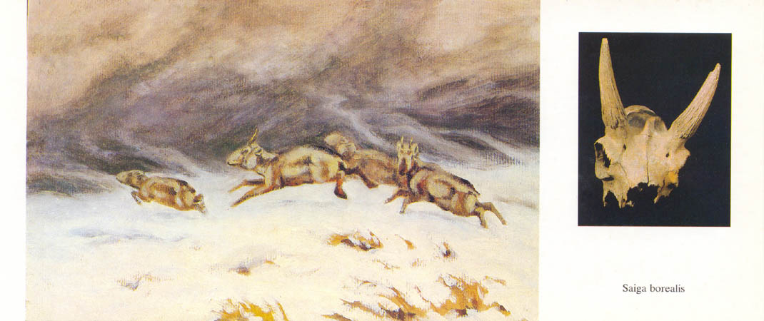 Сайгак — стройная, легкая антилопа небольшого роста (около 75 см в холке), исключительно приспособленная для жизни на открытых пространствах. У нее мясистый широкий нос со сложной системой фильтров, предохраняющих дыхательные пути от попадания пыли (бежит сайгак, низко опустив голову к земле). Совершенно непонятно, в каких степях могло возникнуть столь удивительное приспособление? Другие особенности животного говорят о привычке жить в очень суровых климатических условиях, при недостатке пищи. Сайгак — настоящая северная антилопа.