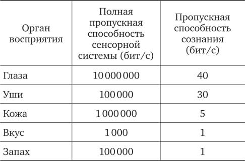 (обратно)11 млн – это очень скромная оценка числа битов, передающихся в мозг, поскольку в ней не учитываются внутренние ощущения. С учётом оценок количества нервных клеток в нашем теле (в диапазоне от 10 до 100 млрд), каждая из которых способна обрабатывать один бит информации в секунду, учёные предположили, что мы отфильтровываем или отбрасываем от 10 до 100 млрд (!) битов каждую секунду.
