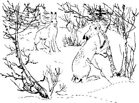 Пришла зима, настали холода, выпал снег. Деревья в лесу и кустарники оголились, и труднее стало прятаться лисе. Охотники начали ездить с собаками. Сидят голодные лисенята в норе, ждут мать, сами вылезти боятся, а она долго не идёт, потому что боится бежать прямо к норе, боится показать дорогу охотнику. Кружится лиса возле норы, путает следы, сбивает с пути собак.