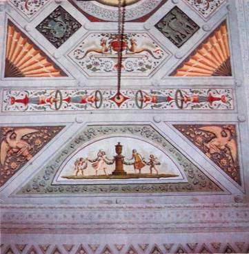 Кажется, все цвета, имеющиеся в интерьере, объединены в полихромной росписи плафона, выполненной итальянским живописцем Феррари на помпеянские мотивы. Хорошо сохранившаяся без реставрации роспись поражает нежным сочетанием тонов: голубого, светло-зеленого, розового, желтого и оранжевого.