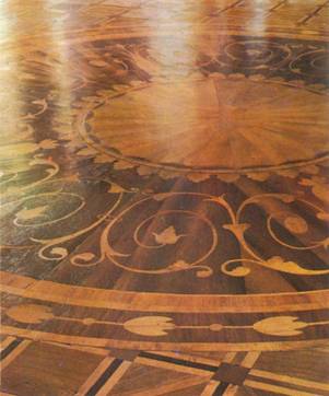 Нарядности зала вторит рисунок паркета. Останавливают внимание три паркетные вставки, выполненные Тауде: круглая - в центре и симметричные прямоугольные по краям. По темному фону ореха проходит рисунок грациозно извивающихся стеблей аканта, набраннный из березы.