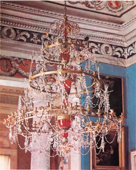 Для освещения Картинной галереи использовались разнообразные осветительные приборы: канделябры, выполненные из золоченой бронзы, и своеобразные вазы-канделябры синего стекла, резные деревянные торшеры и хрустальные жирандоли. С потолка низко спускаются три люстры, центральная на тридцать и крайние на шестьдесят свечей. Бронзовые золоченые ободы и яркие стержни цветного стекла завешены гирляндами хрусталя. Несмотря на огромные размеры, люстры кажутся воздушными. Особенно эффектны были они при зажженных свечах, свет которых, отражаясь и преломляясь в многочисленных гранях хрусталя, заставлял их переливаться всеми цветами радуги.