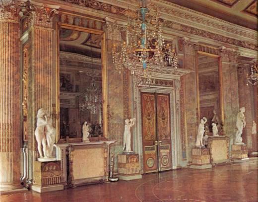 Знакомство с залами начинается с верхней площадки парадной лестницы. Анфилада комнат кажется бесконечной благодаря огромному зеркалу, помещенному в последнем зале.