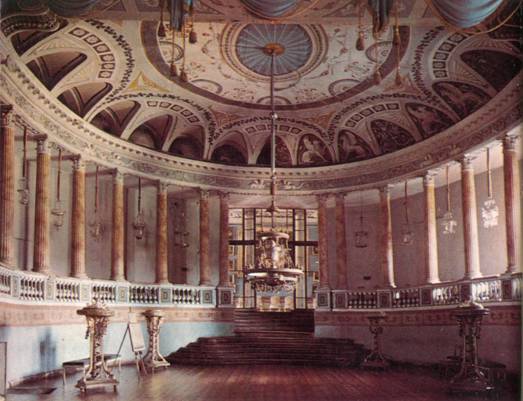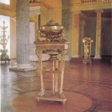 Несколько холодный голубой тон смягчается обилием позолоты: золоченой резьбой на дверях, стенах, мебели, «солнечным» тоном колонн, облицованных искусственным мрамором.