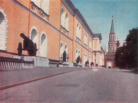 На белокаменных постаментах у стен Арсенала лежат также стволы орудий без лафетов. Это трофеи Отечественной войны 1812 г. Здесь находится почти вся когда-то грозная артиллерия Наполеона. Именно через Троицкие ворота, мимо Арсенала, вошел в Кремль «покоритель Европы», и спустя некоторое время через эти же ворота началось отступление французских войск, закончившееся их позорным бегством из России.