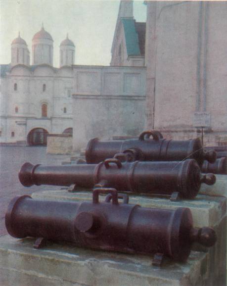На чугунных декоративных лафетах, отлитых в Петербурге в 1835 г., стоят огромные многопудовые пушки XVI - XVII веков: «Аспид», «Волк», «Троил», «Инрог», «Новый перс», «Онагр» и другие. Некоторые из них участвовали в походах Ивана Грозного на Смоленск и Казань, в Ливонской войне. Эти пушки отлиты знаменитыми русскими литейщиками Андреем Чоховым, Мартьяном Осиповым, Яковом Дубиной и другими мастерами.