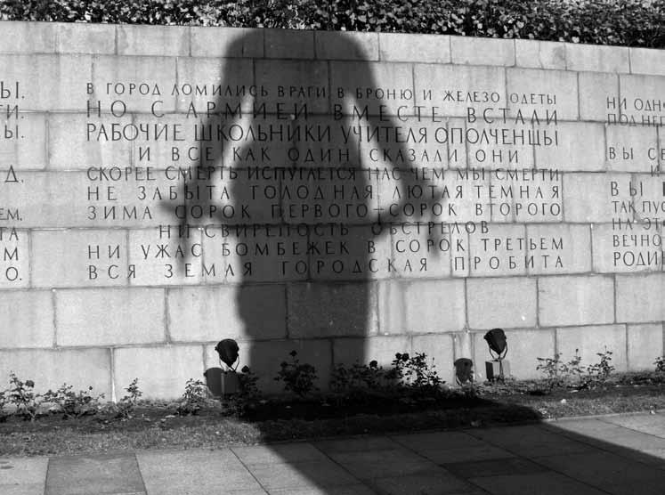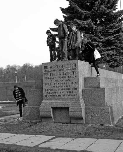 В отличие от волны демонстративного сноса памятников, прокатившейся по другим регионам Восточной Европы, включая Москву (начиная с памятника Дзержинскому, свергнутого с пьедестала 22 августа 1991 года), в Петербурге подобных эпизодов не было вообще – возможно, в городе еще жила память о безудержном сносе монументов после 1917 и вплоть до 1930-х годов. Самый известный случай переноса памятника касается дореволюционной скульптуры. За решеткой тихого двора перед Мраморным дворцом стоит угрюмый, громоздкий памятник царю Александру III работы русско-итальянского скульптора П. Трубецкого – до 1937 года статуя украшала площадь Восстания (до революции – Знаменскую), потом на его месте разбили сквер, потом водрузили пьедестал для памятника Ленину и, наконец, в 1985 году – обелиск в память о Великой Отечественной войне, который и сейчас возвышается на этом месте на фоне единственного оставшегося в городе лозунга (на фасаде гостиницы «Октябрьская»), гласящего: «Ленинград – город-герой»[16].