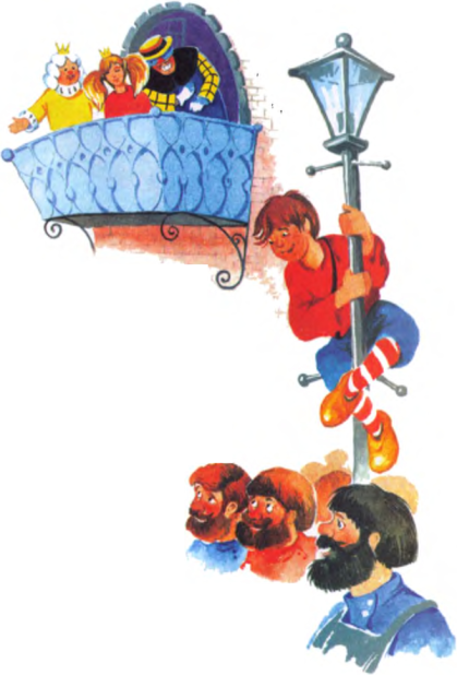 Пёс взобрался на спину Ослу, Кот вскочил на голову Псу, а юноша подпрыгнул и оказался стоящим на голове Кота, да ещё кверху ногами. Пирамида получилась такая высокая, что лицо юноши пришлось прямо напротив лица Принцессы, стоящей на балконе. Глаза их встретились. И они, конечно же, сразу полюбили друг друга.