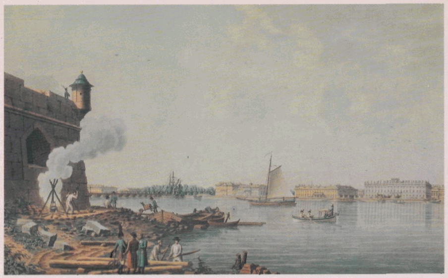 На этом листе, входящем в серию гравюр 1799 года, посвященных набережным Невы, слева изображен угол недавно облицованного бастиона Петропавловской крепости. За Невой - панорама набережной от Летнего сада до Мраморного дворца.