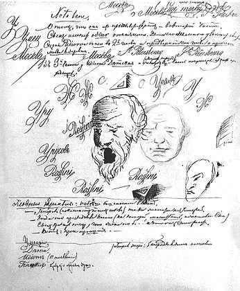 108. А. А. Краевский и Ф. М. Достоевский. Карикатура Н. А. Степанова, 1848 г.