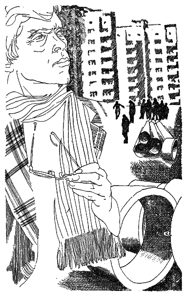 Худощавый, лобастый человек. Серебряный чубчик. Иронический рот и близорукость придают его облику некоторую надменность. Но стоит ему снять очки — выражение глаз станет беззащитным, печальным. Он чем-то на Грибоедова похож.