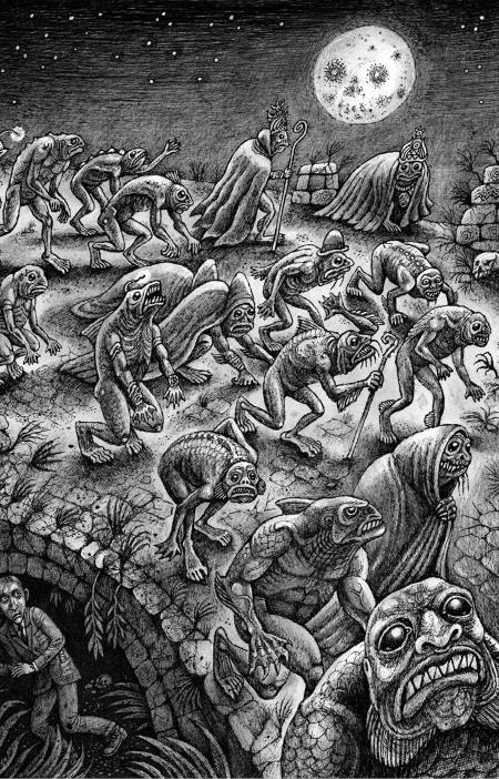 На илистых берегах тамошних ручьев и на иссохших клочках земли они находили диковинные отпечатки лап и клешней, а также выложенные из камней таинственные круги с вытоптанной по периметру травой, которые явно не были созданы природой. А на склонах гор обнаруживались диковинные пещеры неведомой глубины, заваленные – отнюдь не случайно! – гигантскими валунами, и множество следов, ведущих как внутрь пещер, так и прочь от них – если, конечно, направление следов было верно определено. Но хуже того: там были замечены существа, которые обычно не попадаются на глаза даже самым безрассудным следопытам в сумеречных долинах и в непроходимых чащах мачтового леса, далеко за привычными границами областей, обычно посещаемых туристами.