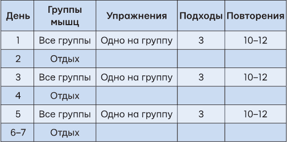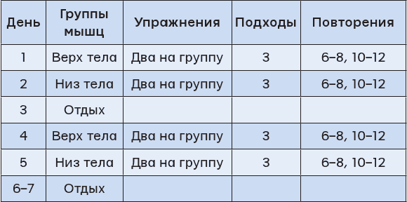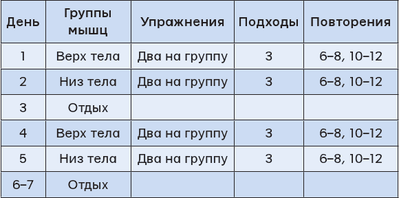 Развиваясь далее, по мере того как ты приобретаешь опыт выполнения упражнений на одну мышечную группу, ты можешь себе уже позволить тренировать все тело не за два дня, а за три дня. И хотя на тренировке ты можешь сочетать упражнения в абсолютно разных комбинациях, но самыми популярными являются сочетания, когда все жимовые упражнения делаются вместе на одной тренировке (грудь, плечи и трицепс), а все упражнения с тягами (спина и бицепс) делаются на другой тренировке. На третий день тренируются ноги. Пресс и икры можешь прокачать в конце тренировки в любой из этих дней.