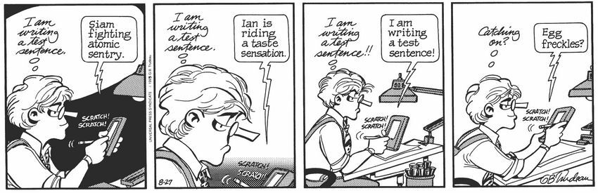 (обратно)Дунсбери (англ. Doonesbury) — газетный комикс, созданный художником Гарри Трюдо. Иллюстрации в комиксе выполнены методом карандашного рисунка. Главным героем комикса является «средний американец» Майкл Дунсбери, который за время выхода комикса «прошел путь» от студента колледжа до пенсионера. — Прим. ред.