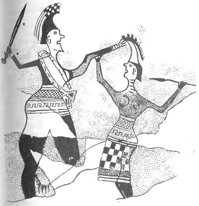 Менелай и Елена — новообретение супруги при разгроме Трои. Рельеф на глиняной амфоре (около 670 года до н. э.). Музей на о. Миконосе.