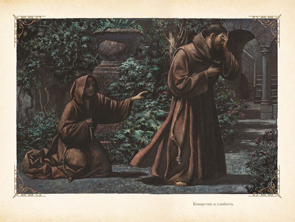 Амброзио, ни живого ни мертвого, оставили одного в камере. Ужас ожидания поглотил его. Он то погружался в мрачное молчание, то испытывал лихорадочный подъем, то принимался заламывать руки и проклинать тот час, когда явился на свет. В один из таких моментов взгляд монаха упал на таинственный подарок Матильды. Его бешенство мгновенно утихло. Он пристально рассмотрел книгу, взял ее в руки, но немедленно отбросил, будто обжегшись. Он заметался по камере из угла в угол, потом остановился и опять уставился на упавшую книгу. Ему подумалось, что это единственный выход из его ужасного положения. Он нагнулся и подобрал книгу, но еще немного поколебался, и желая, и опасаясь испробовать заклинание.