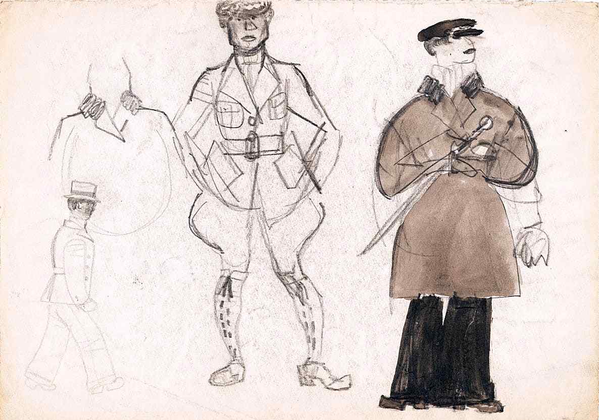 У меня уцелел один рисунок времени более позднего (1900): „Атака английских кавалеристов на бурские окопы“, сохранилось еще шесть-семь тетрадок (1903–1905) с изображениями приключений и подвигов моего старшего брата. Он всюду изображен рыцарем. (Брат мой, будучи старше меня на три с половиной года, очень увлекался историей и историческими романами.) Лишь в последних тетрадях нашли отражение Русско-японская война и Первая революция.