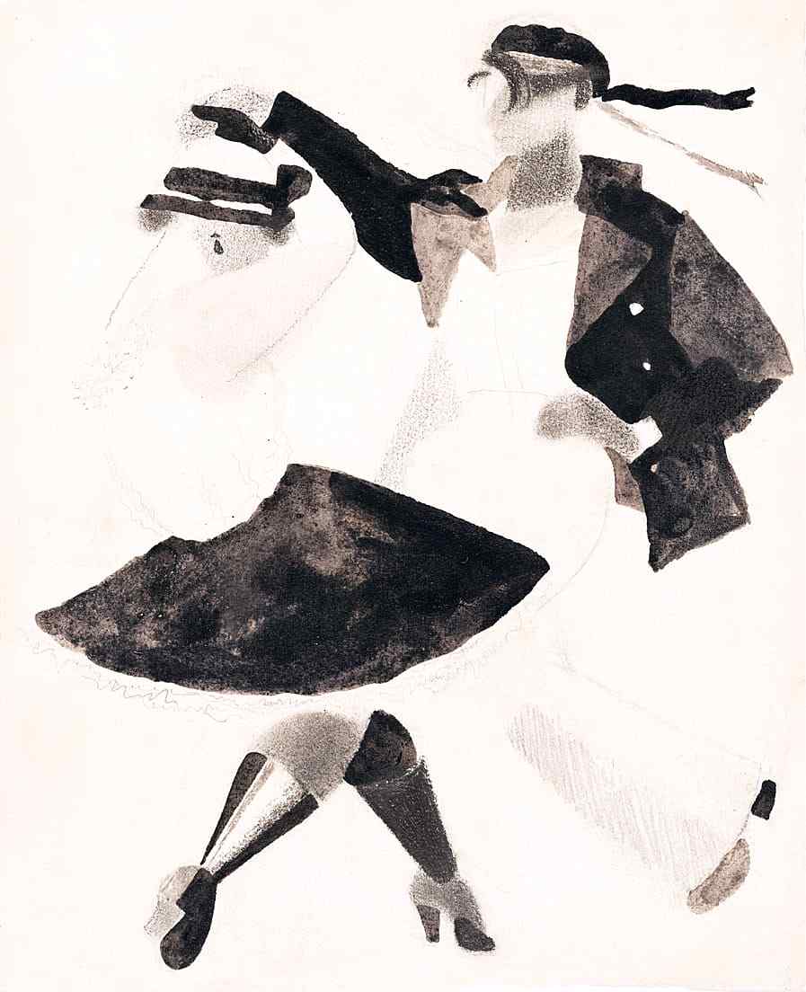Есть рисунки, выполненные острой и гибкой, плавно бегущей, стремительной и гармоничной линией, которая охватывает контуры, сжато синтезируя форму. Бархатистый след угля или свинцового карандаша, нанесенный внутри контура, намечает пластические объемы. Существенно указать, что художник не ищет здесь ни повышенной экспрессивности, ни — еще менее — эффектной красивости. Его натурщицы, коренастые и коротконогие, с отвислой грудью и широким тазом, увидены и переданы со всепоглощающим и беспощадным интересом к жизненной правде или подчас с оттенком иронии, которая, впрочем, не исключает любования. В этой группе рисунков, наиболее обширной, нельзя не заметить известной близости к графике Б. Д. Григорьева, именно в те годы привлекшей к себе пристальное внимание петербургской художественной среды. Критика не без основания говорила тогда о «школе Григорьева» и о том, что «григорьевское» проникает и просачивается в художественную культуру наших дней[14]. Неудивительно, что Лебедев оказался среди тех, кого увлек на недолгое время блистательный и широко прославленный в ту пору «виртуоз линии» Григорьев. Лебедева с Григорьевым объединяли и общие интересы. Оба они с острым любопытством присматривались к ночной жизни столицы, к быту и облику городских подонков. В одном из ленинградских частных собраний сохранилась картина «Катька», написанная Лебедевым около 1916 года и, быть может, еще более близкая к манере Григорьева, чем натурные рисунки. Однако в руках Лебедева приемы, созданные его старшим товарищем, обретают иную функцию и иной характер. Рисунки Лебедева строже и серьезнее григорьевских, натура в них наблюдена острее и тоньше.