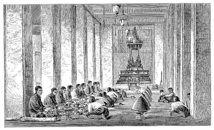 Гостиница – беленое кирпичное здание – изначально предназначалась для иностранных послов и других официальных лиц, прибывавших с визитами ко двору сиамского короля. Обращенная фасадом к островам летняя резиденция короля – крупнейшее сооружение в городе, но оно не отличается ни достоинством, ни красотой. Несколько храмов и монастырей в глубине заполоняют толпы монахов – с бритыми макушками, в желтых одеяниях – и своры паршивых бродячих собак, которые ходят за ними по пятам. Эти монастыри состоят из множества маленьких комнат (келий), в которых из обстановки только циновка да деревянная подушка для каждого из их обитателей. Остатки еды, что монахи выпрашивают днем, вечером выбрасываются собакам, ну а то, что они не съедают, обречено на гниение. И, конечно, разлагающиеся пищевые отходы под сиамским солнцем смрад распространяют невообразимый.