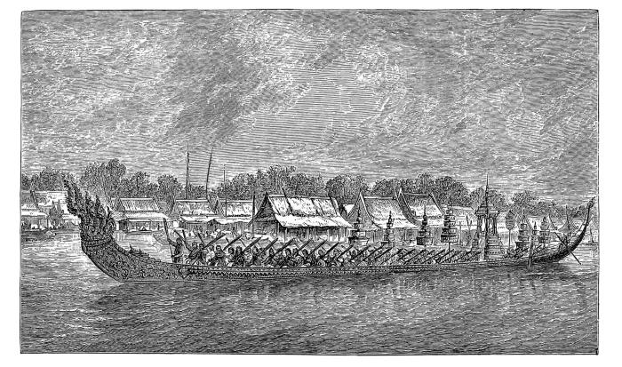 Мы бросили якорь в глубоких водах близ какого-то острова. В следующее мгновение река ожила. К нам со всех сторон устремились некие странные плавучие средства, управляемые земноводными существами. Полуголые, смуглые, отвратительные, они оглашали воздух пронзительными криками на непонятном языке. Вдалеке вырисовывались очертания нескольких сиамских военных кораблей, древних на вид, как сама земля. Справа высились одна над другой широкие крыши величественного королевского дворца. Это был мой будущий дом, где мне предстояло трудиться.