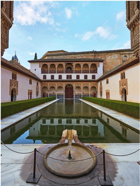 Архитектура дворца Комарес строится вокруг Миртового двора (рис. 22). Украшенный вечнозелеными миртами и вытянутым бассейном двор ведет в галерею, через которую можно попасть в зал де ла Барка. Он получил название из-за потолка, напоминающего дно корабля. Де ла Барка примыкает к большому Залу Послов (рис. 23), расположенному в башне Комарес, самой большой башне дворца (45 м). В Посольском зале под высоким, 18-метровым потолком, стоял трон правителя.
