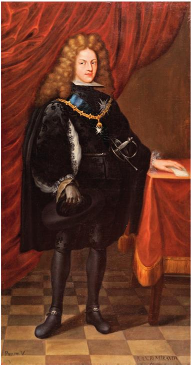 С 1713 года Габсбургов на троне сменила ветвь французской династии Бурбонов. Будущий король Филипп V изображен на портрете кисти Пьера Миньяра (рис. 81). Когда он становится монархом, французский художник Жан Ранк старается учесть вкусы испанского двора и создает традиционный символический портрет (рис. 82), отчасти схожий по композиции с конным портретом Филиппа IV кисти Веласкеса. Вторит испанской живописи нейтральный пейзаж на фоне, тогда как во Франции было принято использовать в качестве декораций пышные занавесы и элементы архитектуры.