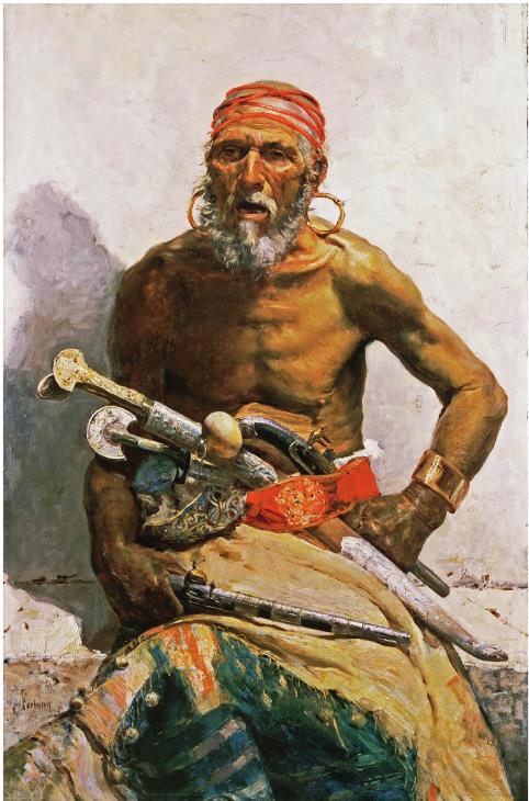 В «Арабском вожде» (рис. 99) стоит обратить внимание на позу главного героя, которая не статична и дает убедительный образ живой и эмоциональной речи. Особое внимание привлекает богато украшенное оружие за поясом героя. Фортуни был страстным коллекционером, поэтому мир вещей занимает важное место в его живописи.