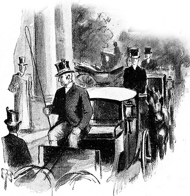 (обратно)Ольстерское пальто — длинное просторное пальто из твида или верблюжьей шерсти, с поясом, иногда с капюшоном (от названия ирландской провинции Ольстер, где оно впервые вошло в обиход в XVIII в.). Хэнсом — двухколесный кэб для двух пассажиров и кучера, сидевшего на особом сиденье сзади. Был назван так в честь человека, первым предложившего конструкцию подобного экипажа.