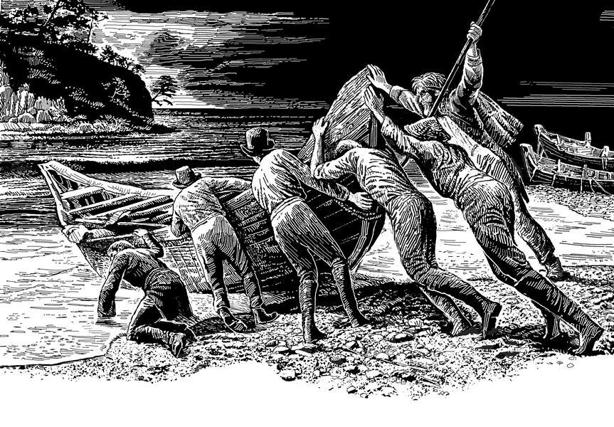 И тут Тишка вдруг преобразился. Его синие глаза, глядевшие до этого немного сонно, вдруг оживились. В них блеснула сила. Он поддержал Васю за плечо и помог ему ухватиться за опрокинутый дощаник.