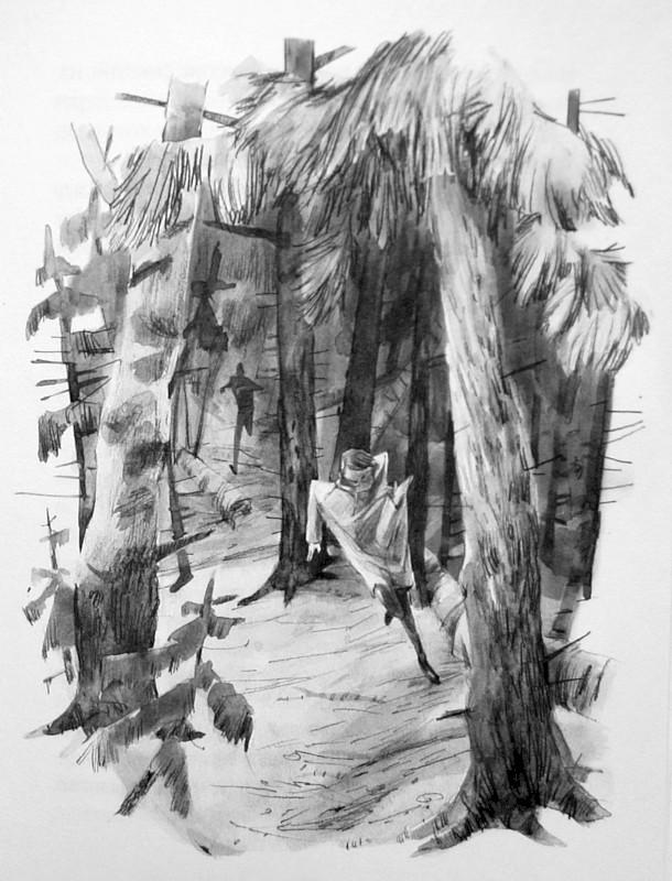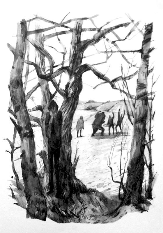 Они все трое с собаками стояли под деревом. В птицах и животных я разбираюсь неплохо, а в деревьях — намного хуже, поэтому про это дерево могу сказать только то, что оно было очень большим и старым. Росло оно на склоне на самом краю Зарошки. Его кривые толстые корни сначала уходили под землю, а потом выпрыгивали наружу, как дельфины из морской волны.