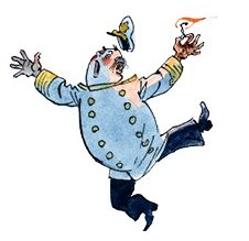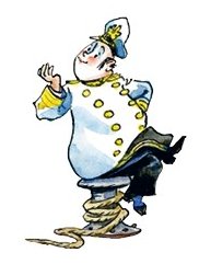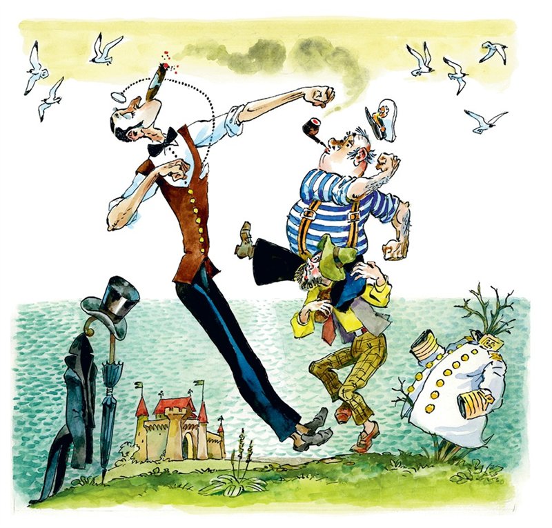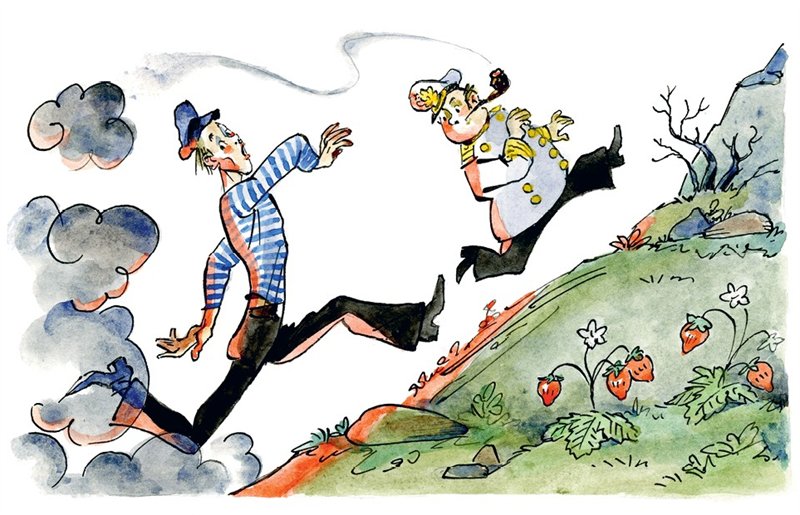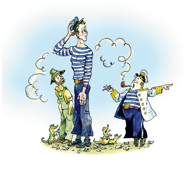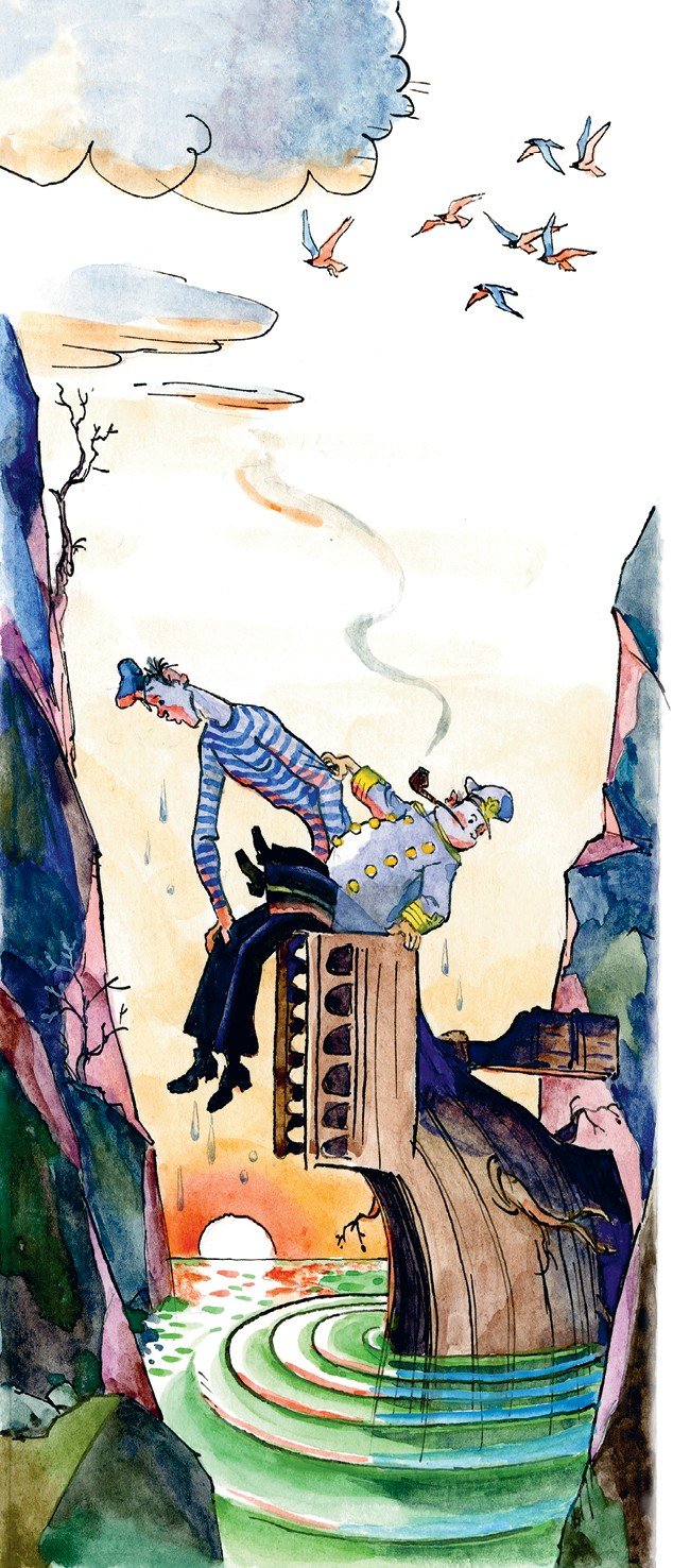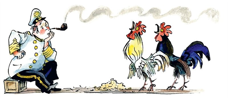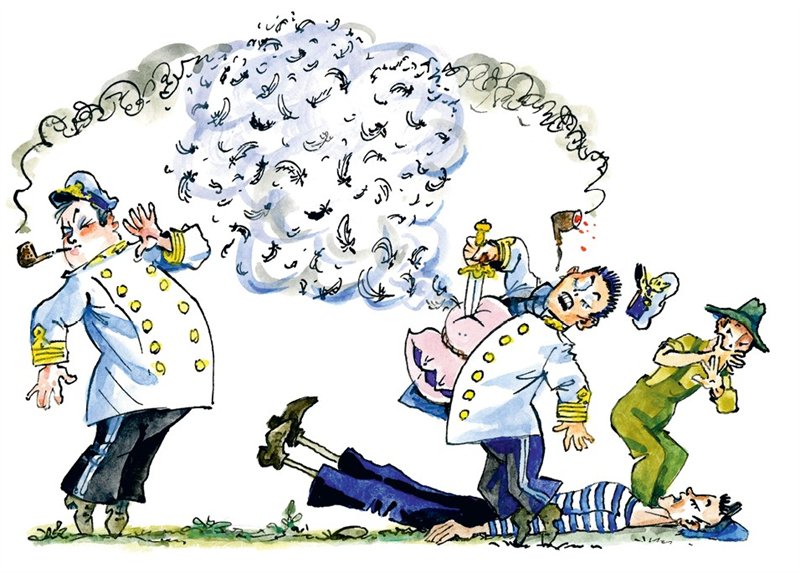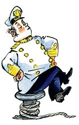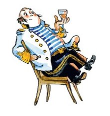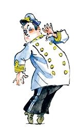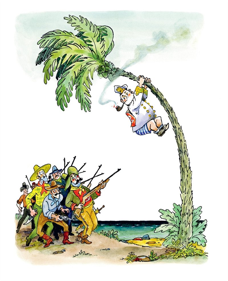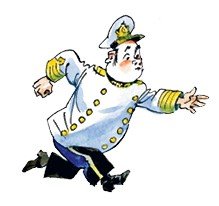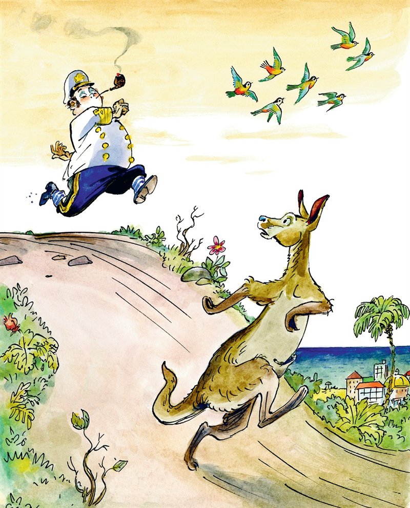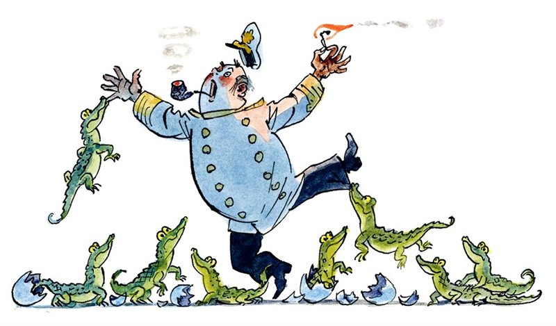 Вместо скромного отставного аптекаря за столом, углубившись в чтение какой-то древней книги, сидел грозный капитан в полной парадной форме, с золотыми нашивками на рукавах. Он свирепо грыз огромную прокуренную трубку, о пенсне и помину не было, а седые растрёпанные волосы клочьями торчали во все стороны. Даже нос, хотя он действительно и покраснел, стал у Врунгеля как-то солиднее и всеми своими движениями выражал решительность и отвагу.