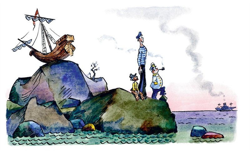 – А как же! – обиделся Врунгель. – Я-то? Я плавал. Я, батенька, плавал. Очень даже плавал. В некотором роде единственный в мире кругосветный поход на двухместной парусной яхте. Сто сорок тысяч миль. Масса заходов, масса приключений… Конечно, теперь времена не те. И нравы изменились, и положение, – добавил он, помолчав. – Многое, так сказать, предстаёт теперь в ином свете, но всё же, знаете, оглянешься вот так назад, в глубину прошлого, и приходится признать: много было и занятного, и поучительного в том походе. Есть что вспомнить, есть что порассказать… Да вы присядьте…