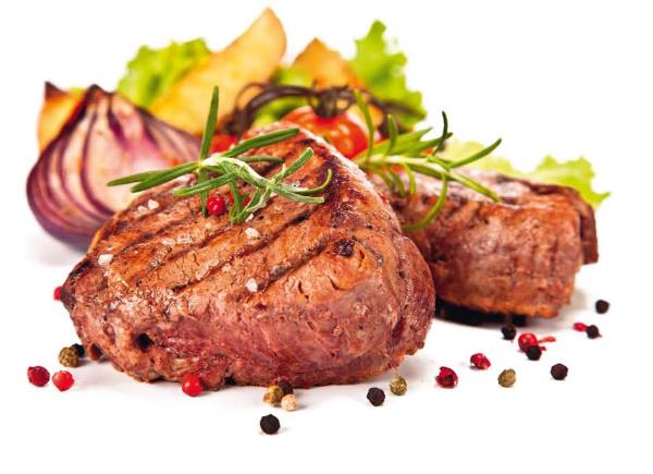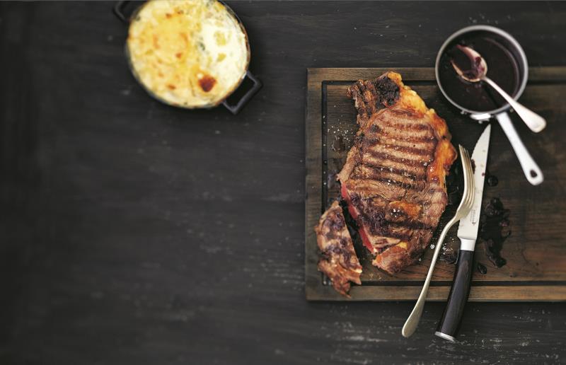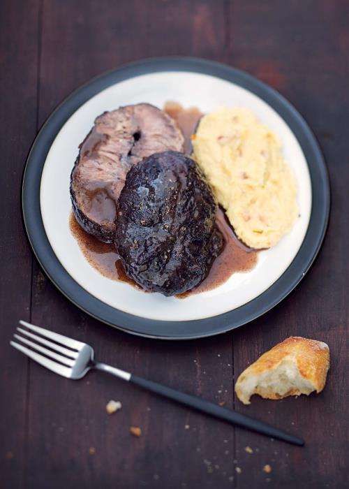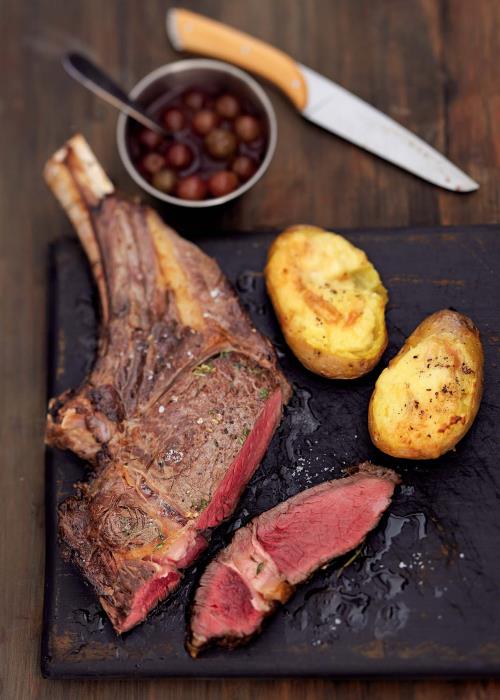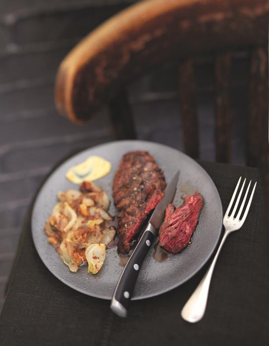 Тем временем запеките картофель под грилем. Порежьте мясо на тонкие ломтики и подавайте вместе с фаршированным картофелем и приготовленным соусом винерон.