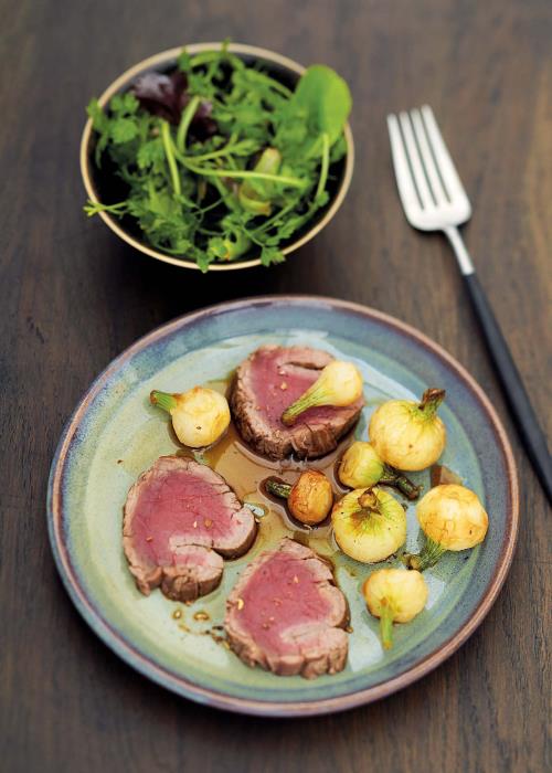 Снимите с мяса пленку и порежьте кусочками шириной 8–10 мм. Разложите по тарелкам с луком. Сбрызните соевым соусом. Подавайте с салатом.