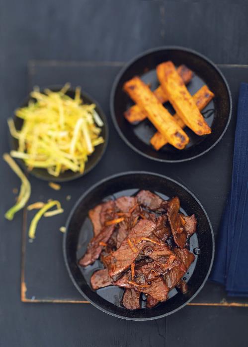 Накануне очистите и измельчите имбирь. Разрежьте говяжье филе пополам в длину, затем 3–4 минуты обжаривайте на сильном огне на сковороде с растительным маслом. Выложите на тарелку. Слейте жир, затем дегласируйте 150 мл соевого соуса. Добавьте имбирь и паприку. Обильно поперчите и посолите соус. Выпарите до консистенции сиропа.