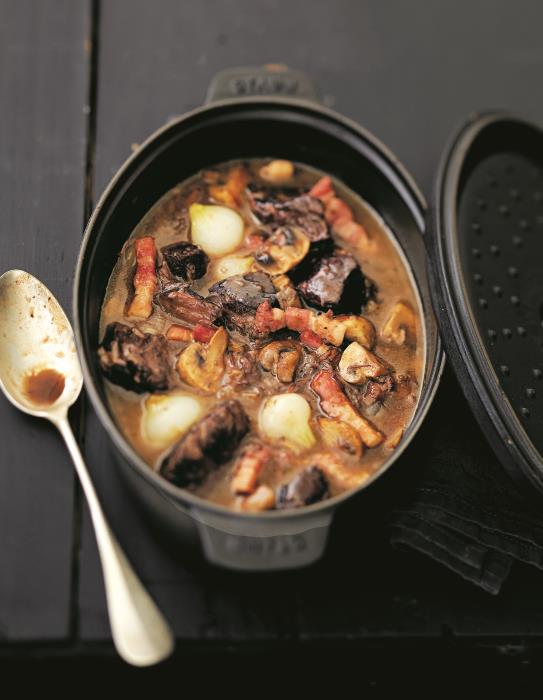 Очистите и измельчите 150 г шалота. Положите в кастрюлю, добавьте 400 мл красного вина и 1 веточку свежего тимьяна. На среднем огне выпарите ⅔ объема. Добавьте 200 мл концентрированного телячьего бульона (см. с. 10), посолите, поперчите. 15 минут выпаривайте на среднем огне до получения достаточно густого соуса. В конце варки, взбивая, добавьте 20 г сливочного масла.