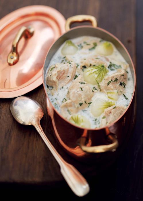 Очистите и порежьте 1 крупную головку репчатого лука. Положите в кастрюлю с 150 мл белого уксуса и выпаривайте почти досуха на среднем огне. Добавьте 300 мл жидкой сметаны, посолите и поперчите. Взбивая время от времени, выпарите наполовину на среднем огне, чтобы получился густой соус.