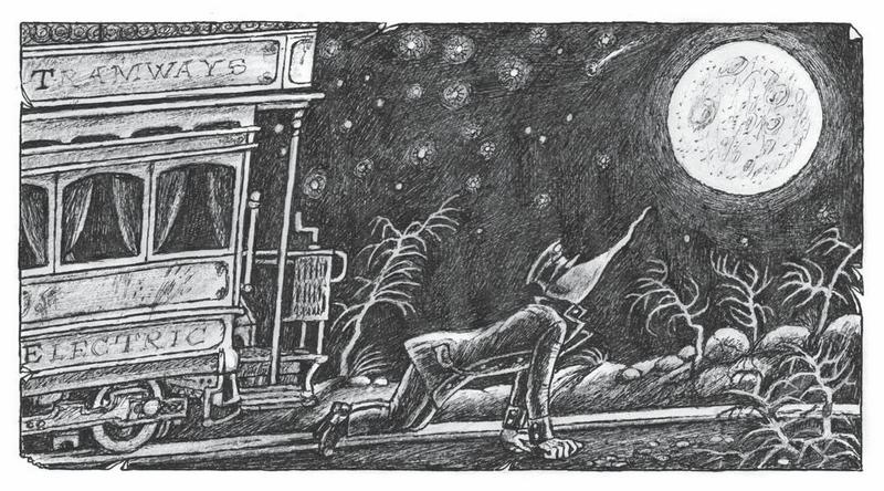 И теперь я заперт в этом кошмаре. Первая ночь сменилась рассветом, и я бесцельно бродил по пустынным болотам и резко обрывающимся тропам. Когда наступила ночь, я все еще бродил, надеясь проснуться. Но вдруг я раздвинул сорняки и увидел перед собой все тот же трамвай-двухвагонник – а рядом с ним чудовище с конусовидной мордой, злобно воющее на луну.