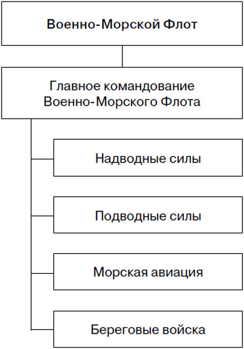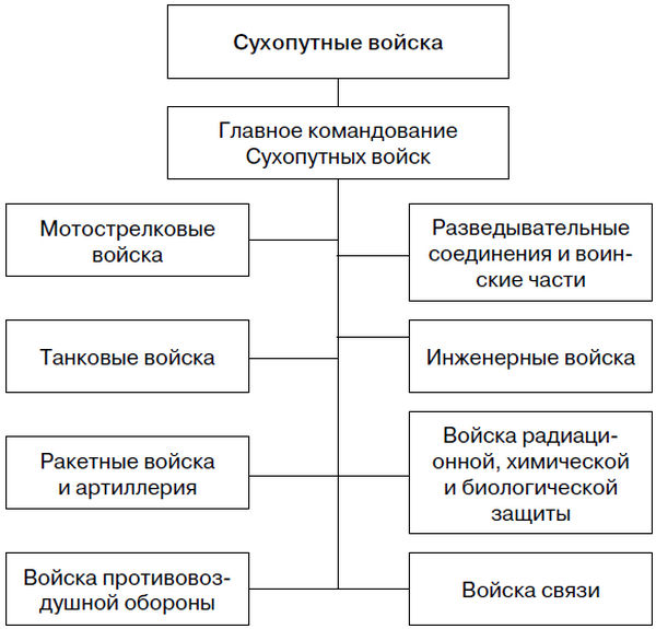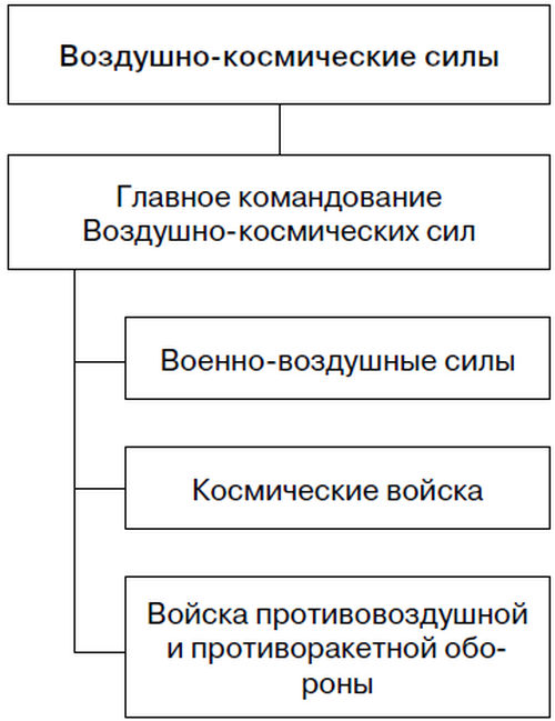 Организационно Вооружённые Силы Российской Федерации включают в себя центральные органы военного управления, три вида: Сухопутные войска, Воздушно-космические силы, Военно-Морской Флот и два рода войск: Ракетные войска стратегического назначения, Воздушно-десантные войска (схема 3).
