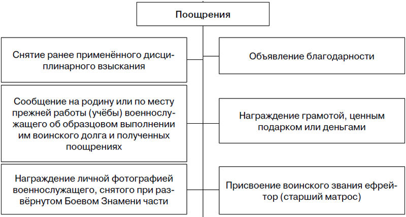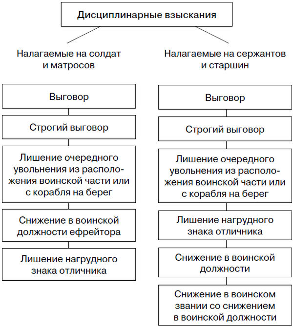 Юридическим средством поддержания и укрепления воинской дисциплины служит дисциплинарная ответственность военнослужащих. Её главной целью является предотвращение дисциплинарных проступков с их стороны и воспитание совершивших правонарушения. Привлечение военнослужащих к дисциплинарной ответственности производится путём наложения дисциплинарных взысканий. Основанием для наложения такого взыскания является совершение дисциплинарного проступка или нарушение общественного порядка. Перечень дисциплинарных взысканий, порядок их применения и полномочия командиров (начальников) изложены в Дисциплинарном уставе Вооружённых Сил Российской Федерации.