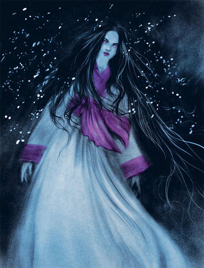 (обратно)Юки-онна – Снежная дама – не связана конкретно с Рождеством, но она представляет собой некий зимний дух, печальный и часто пугающий, так что вполне возможно встретить ее в это время года. Японцы любят праздновать Рождество, но не забывают и о собственном богатом и зачастую жутком фольклоре. Дама часто появляется во время традиционного времени празднования Нового года, так что, как и в европейских легендах, мы видим связь между временем шумного веселья и потусторонним существом, которое является, чтобы испортить веселье.