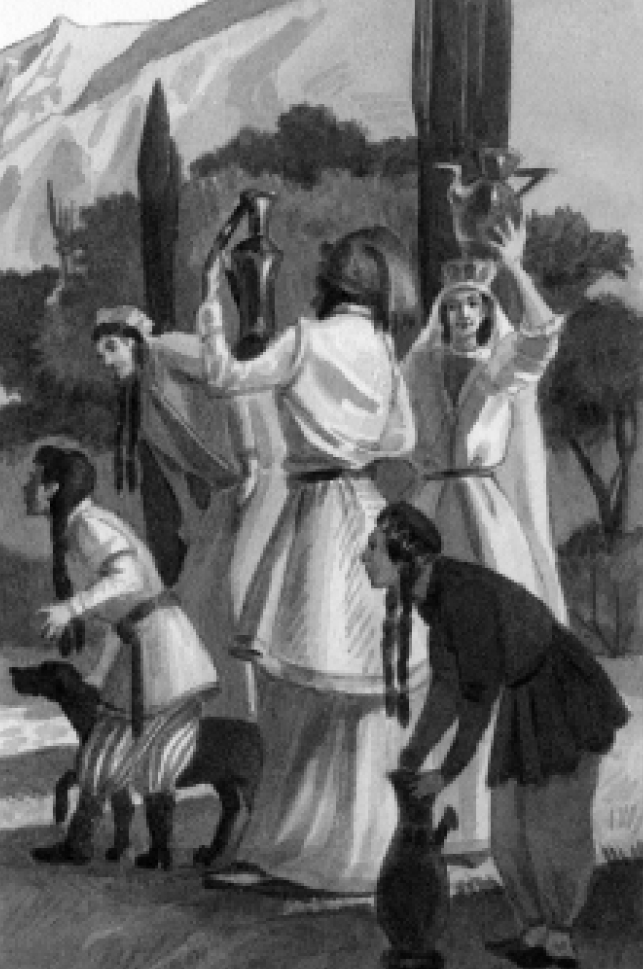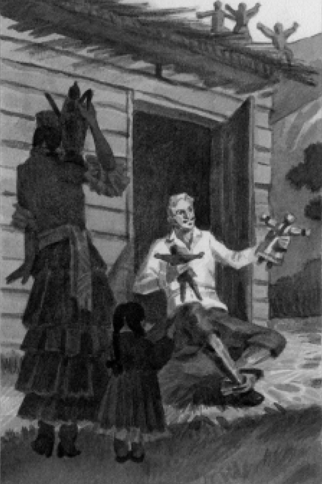 Когда я вышел на поле, где был их дом, я увидал в конце его, по направлению гулянья, что-то большое, черное и услыхал доносившиеся оттуда звуки флейты и барабана. В душе у меня все время пело и изредка слышался мотив мазурки. Но это была какая-то другая, жесткая, нехорошая музыка.