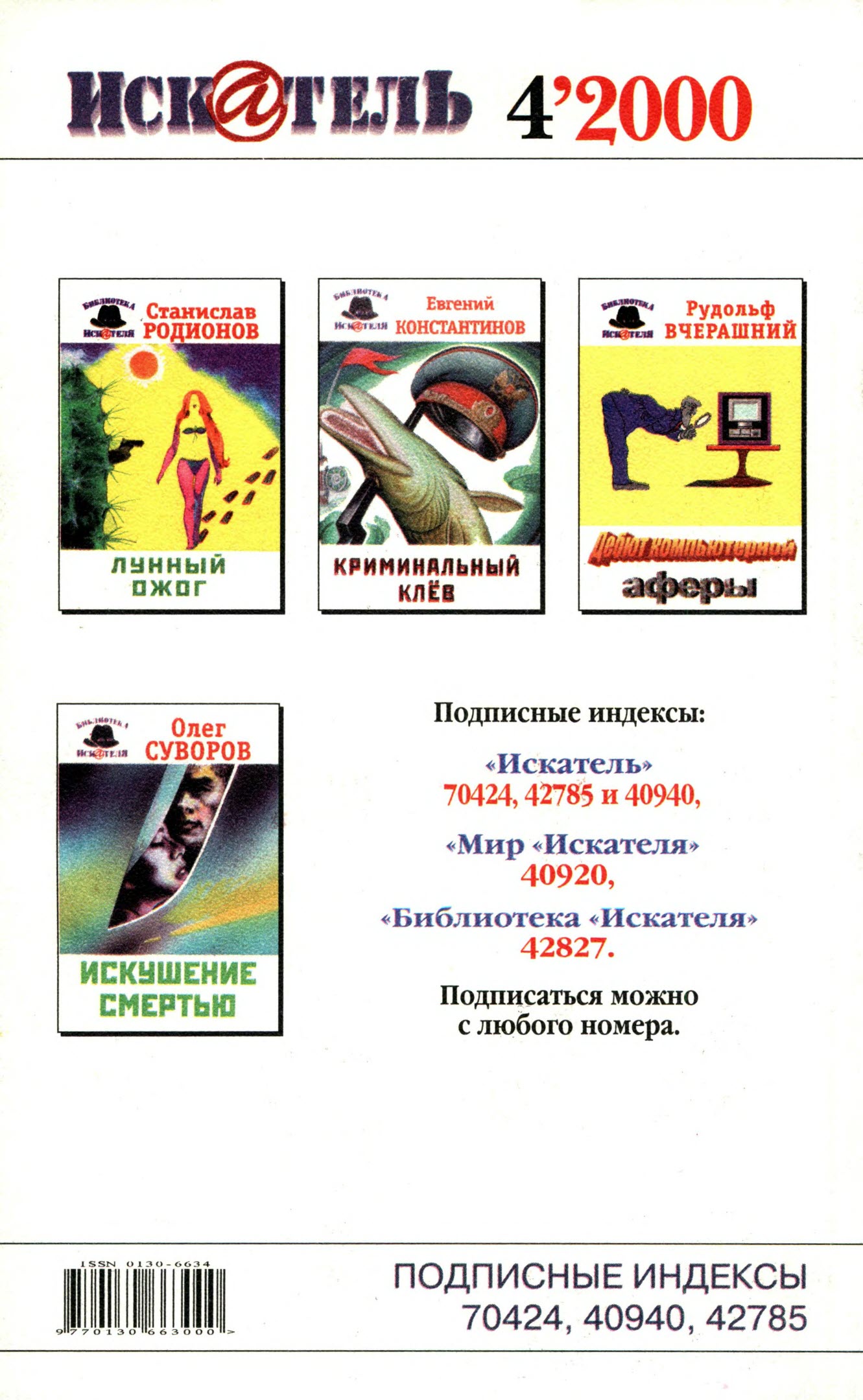 Во втором полугодии 2000 года в журналах «Искатель», «Мир Искателя», «Библиотека Искателя» читайте новые остросюжетные произведения уже хорошо известных вам авторов Василия Головачева, Станислава Родионова, Анны Малышевой, Кира Булычева, Анатолия Ковалева, Данила Корецкого, Александры Марининой, Клиффорда Саймака, Роберта Хайнлайна, Керен Певзнер, Павла Амнуэля, Даниэля Клугера, а также других, среди которых будут и те, кто благодаря своему таланту восходят на литературный небосклон.