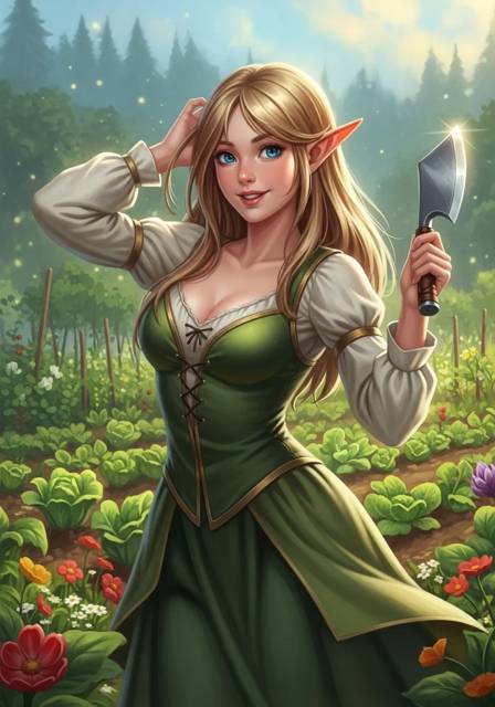 Впереди, правее от дороги, показалось ветхое двухэтажное здание с просторным двором и покосившейся вывеской. Конюшня, заросшая бурьяном, выглядела так, будто её не чистили со времён динозавров. А у ворот стояла… эльфийка? Длинные уши, светлые волосы, голубые глаза, бледная кожа, будто вырезанная из фарфора. И, чёрт возьми, грудь третьего размера, которую не скрывал облегающий зелёный корсет.