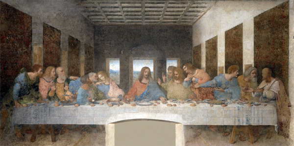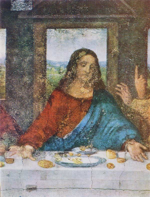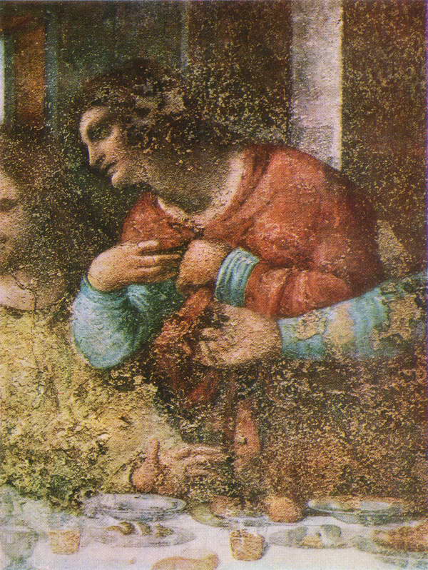 (обратно)Разрушение заключается в том, что слой краски тоненькими цветными лепестками, свертывающимися в трубочки разных размеров, отделяется от сыреющей стены. Художник Луиджи Кавенаги с необыкновенным терпением пытался укрепить эти чешуйки при помощи жидкого клея и даже металлических скобок и долго заботливо следил за картиной, стараясь спасти все, что было можно. После второй мировой войны, когда роспись чудом была сохранена от разрушения (в 1944 году американская бомба почти полностью разрушила трапезную), итальянским ученым удалось успешно провести новую реставрацию «Тайной вечери». — Ред.