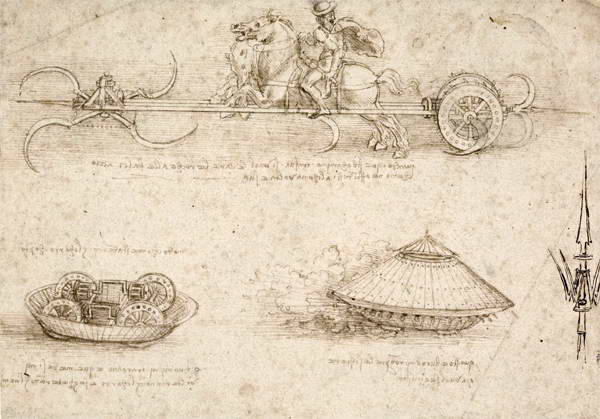 20. Проекты боевой колесницы и самодвижущейся бронированной повозки. Около 1485–1488. Рисунок пером и кистью. Лондон. Британский музей.