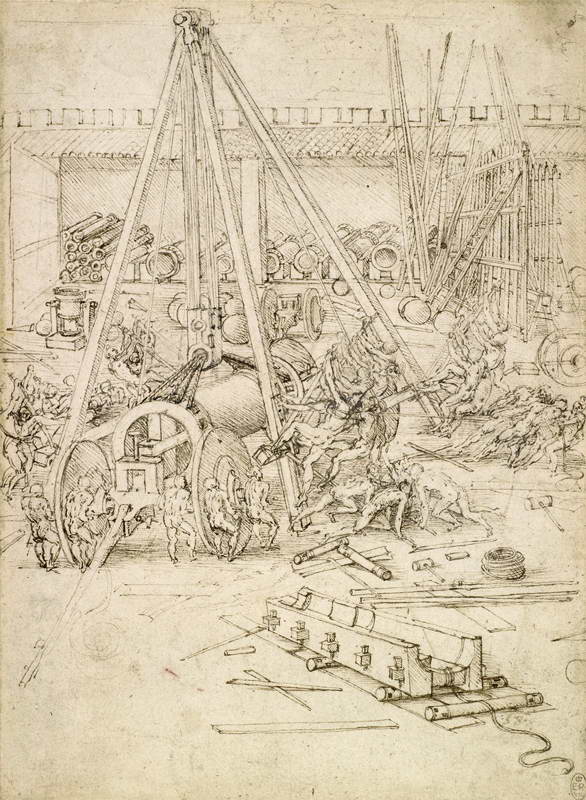 Промышленная техника не была единственной областью, отрывавшей внимание Леонардо от искусства. Время было чревато кризисами всякого рода. После заговора Пацци Флоренция долго воевала с папой Сикстом и с Неаполем, и военные вопросы, ближайшие вопросы военной техники и военно-инженерного искусства, незаметно втянулись в сферу интересов Леонардо. Это не было чем-то необычным; наоборот, военная инженерия по давней традиции входила в круг обучения художнических боттег. Только у Леонардо эти вопросы, как и все другие, построились в несравненно более сложную, с необычайной детальностью разработанную систему. Широту его интереса к военным вопросам мы узнаем, когда познакомимся с его знаменитым письмом к Лодовико Сфорца.